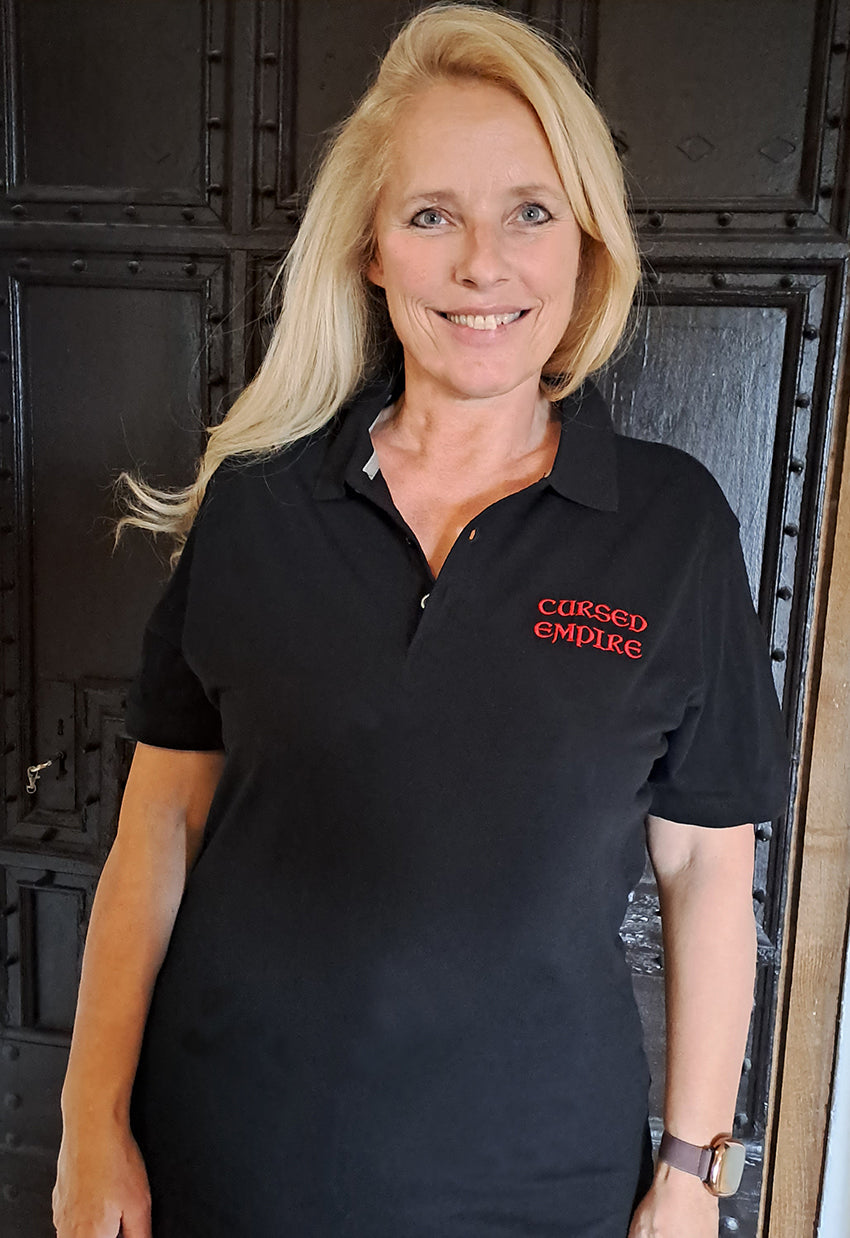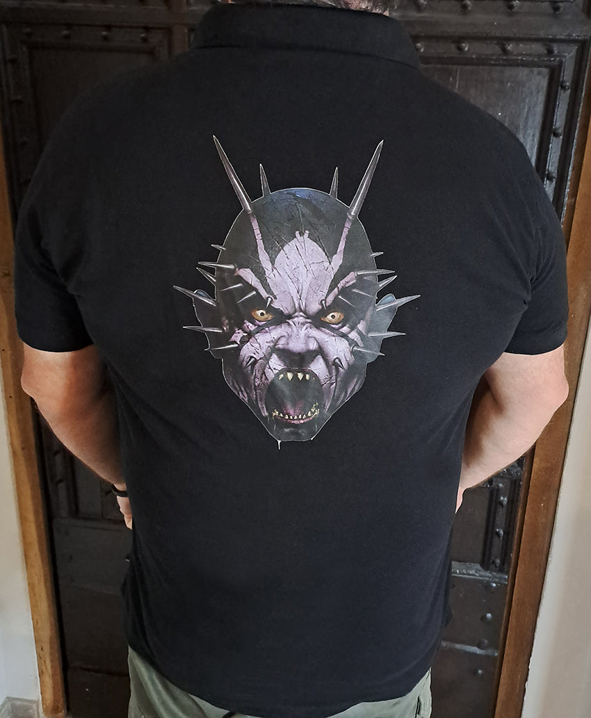 Image du personnage imprimée numériquement au dos, avec inscription Cursed Empire brodée en rouge sur le devant.