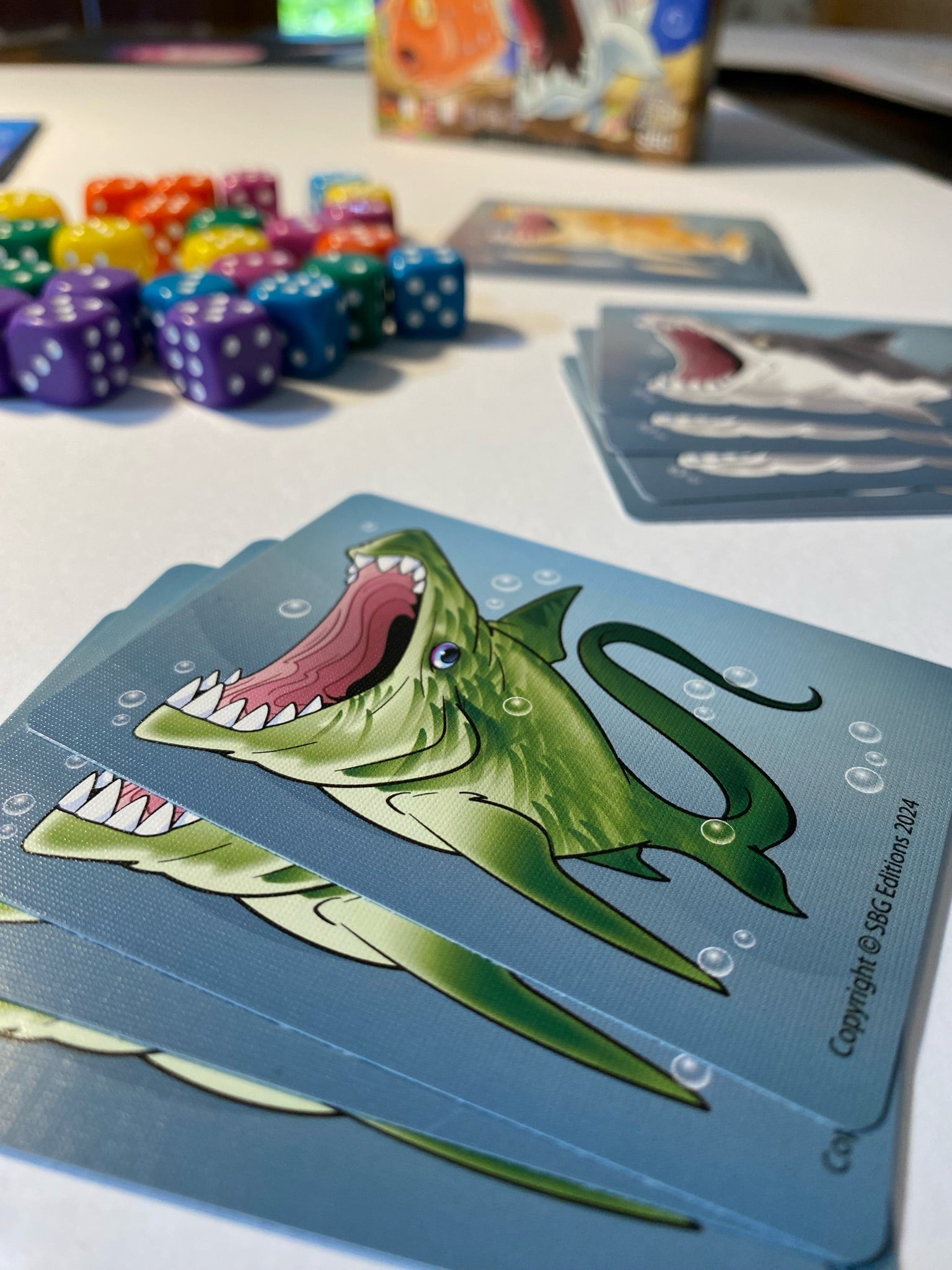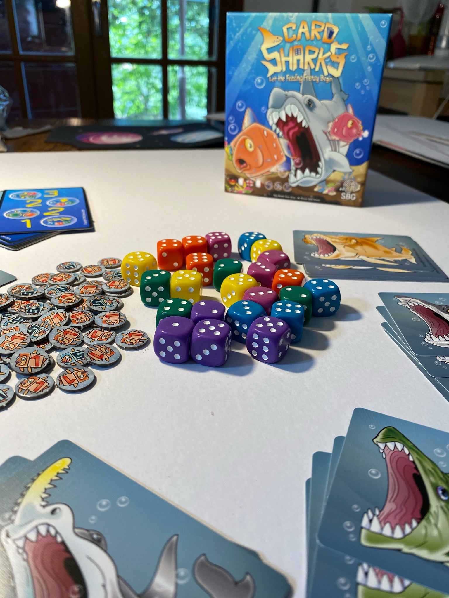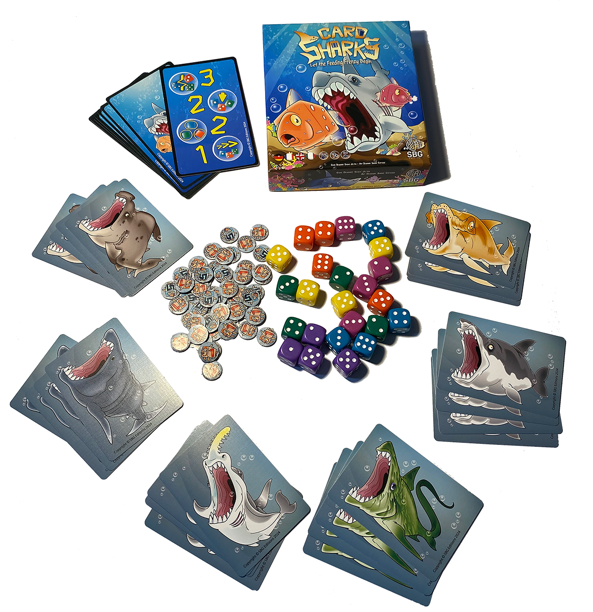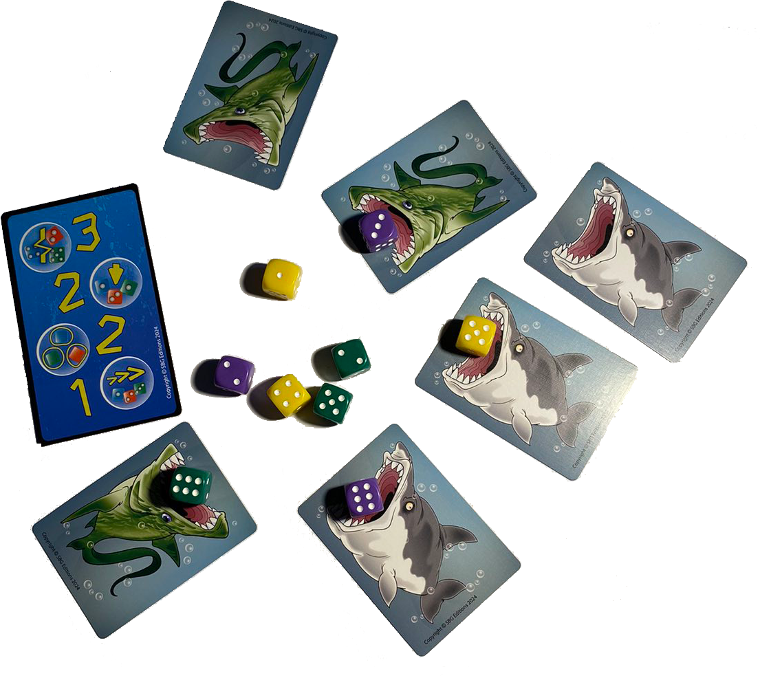 Card Sharks is a crazy, fast-paced, real-time game where each player uses their 3 shark cards to eat the tastiest and highest scoring fish represented by dice based on a series of randomly drawn scoring condition cards.
